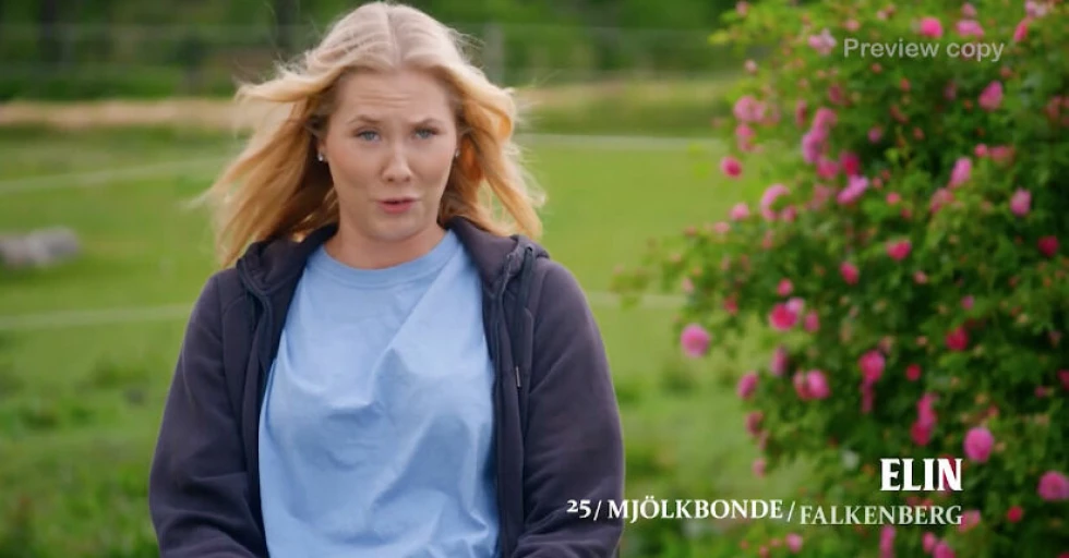 ”Elin jobbar med mjölkproduktion på en gård där vi av produktionstekniska skäl inte kunde spela in”, skriver Clara Tengbom, exekutiv producent för Bonde söker fru.