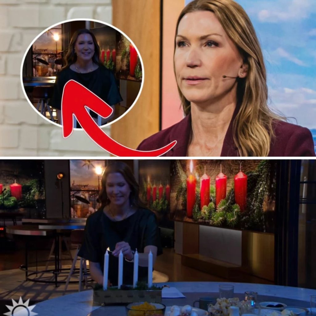 Efter vinjetten möttes tittarna av en delvis nedsläckt studio där programledaren Jenny Alversjö, 51, tände det första ljuset i en adventsljusstake.