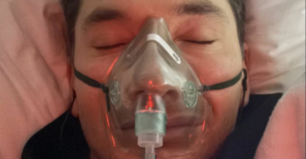 Han postar även en bild på sig själv, liggandes i maskinen, med en syrgasmask för munnen.